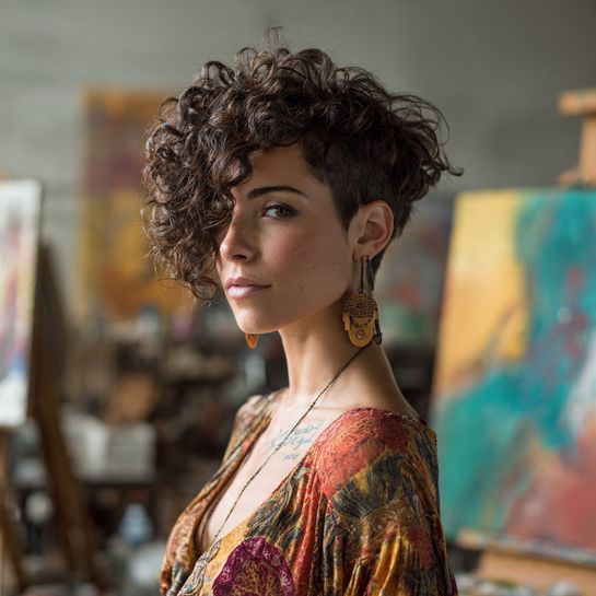 Natural curls create organic asymmetry. Longer curly side contrasts with tighter cropped opposite side for texture-rich dimension.