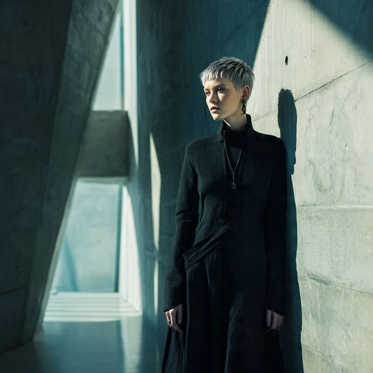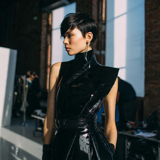 Wet-look styling emphasizes cut’s architecture. Slicked back with gel reveals full asymmetrical structure and face shape.