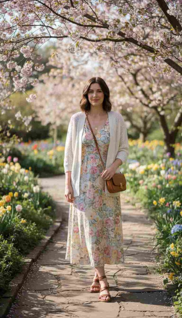 A clean white knit cardigan draped over a floral midi dress creates timeless spring elegance.