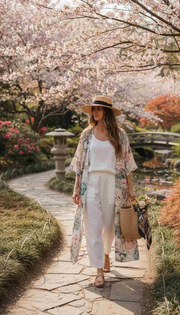 A lightweight kimono-style cardigan over a linen set creates breezy spring sophistication.