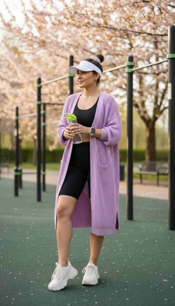 A long cardigan worn with bike shorts creates fashion-forward athleisure layering.