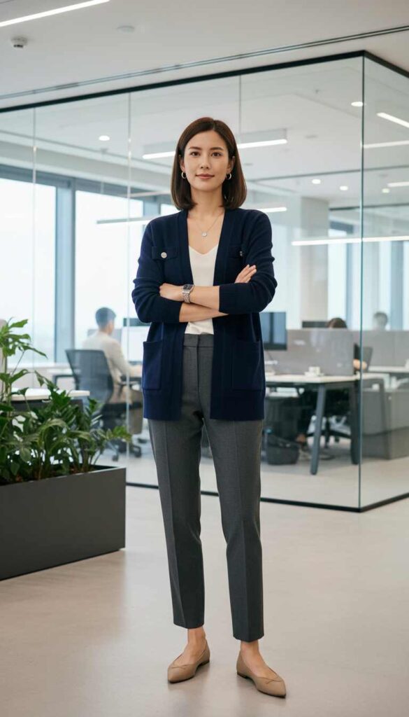 A structured cardigan replacing the blazer in a professional outfit creates softer workplace elegance.
