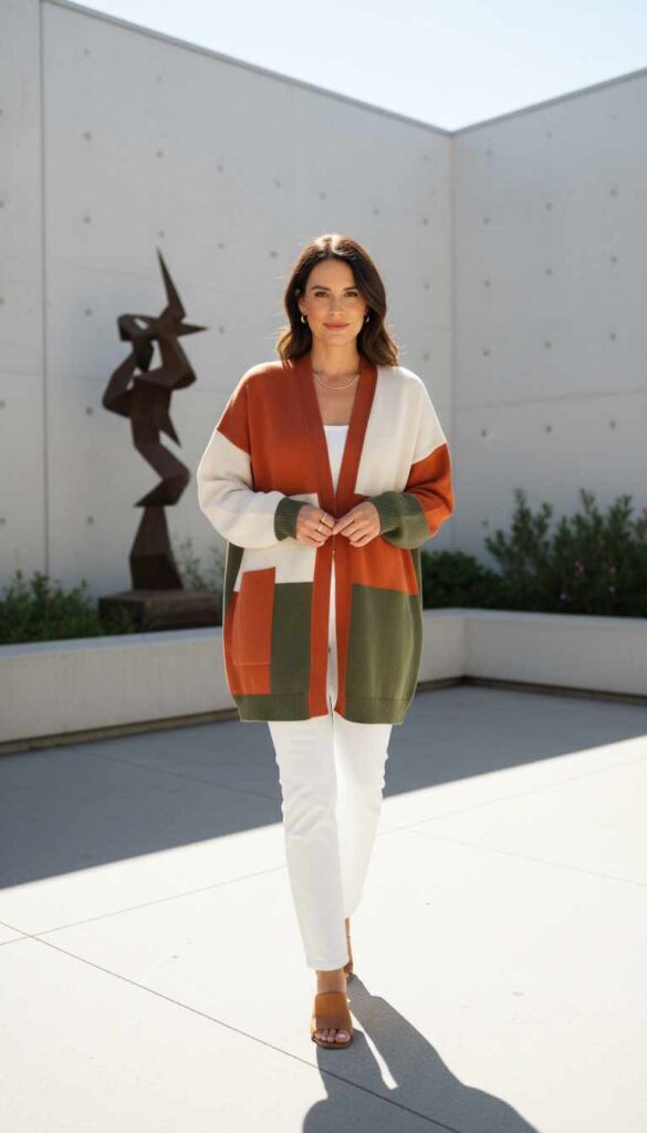 Bold cardigans in deep jewel tones or dramatic patterns make strong personal statements that work best as outfit centerpieces rather than background pieces. When wearing a statement cardigan, keep everything else deliberately simple to let it dominate the visual story.