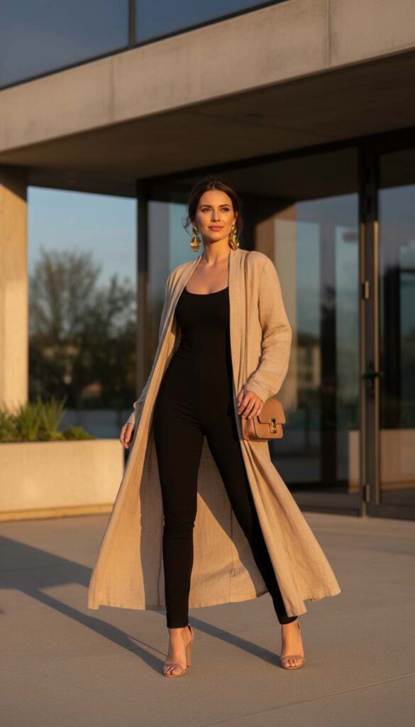 A long open cardigan layered over a sleek jumpsuit adds dimension to simple styling.