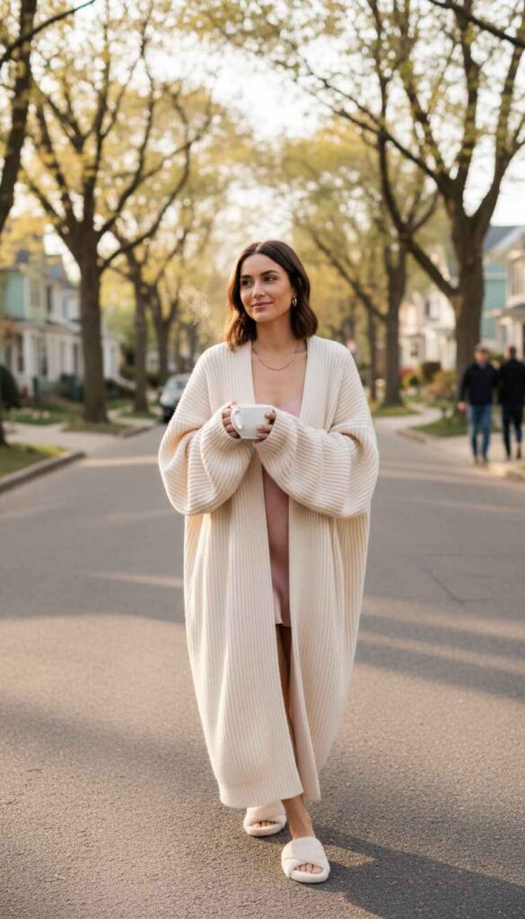An intentionally oversized pajama-inspired cardigan styled deliberately for outside wear.