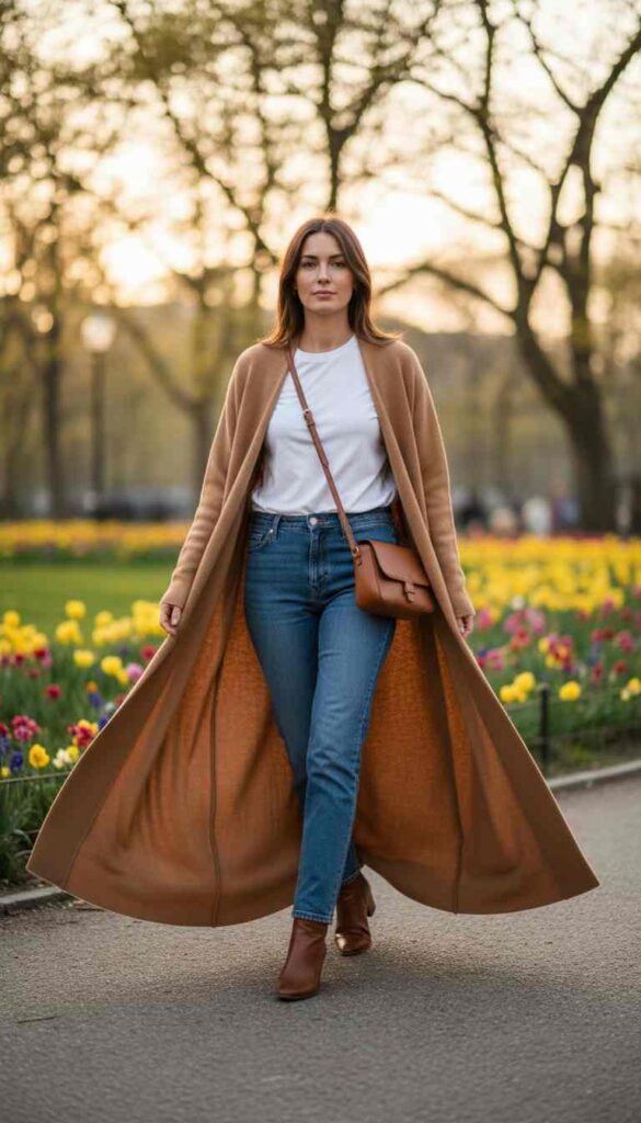 Warm earth tones—camel, rust, terracotta, and olive—in cardigans create sophisticated grounded energy that feels intentional and fashion-forward without demanding attention. These colors align with spring’s earthy renewal aesthetic, echoing soil, new growth, and warming ground.