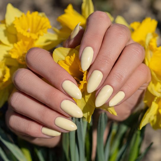 Creamy sunshine optimism. Soft buttery yellow with warm undertones creates cheerful yet sophisticated spring statement.
