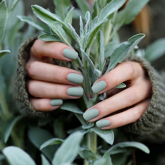 Muted earthy green. Soft sage with grey undertones creates sophisticated natural spring shade.