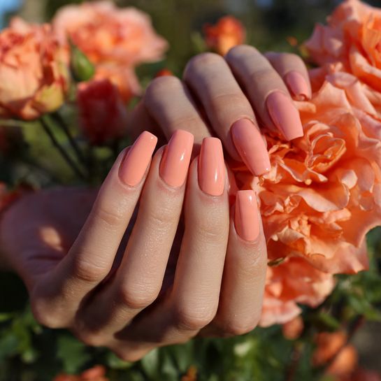 Warm coral-pink fusion. Soft peach with pink undertones creates flattering warm spring glow.