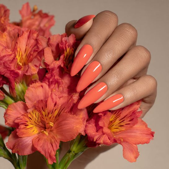 Vibrant orange-pink statement. Bold coral with orange undertones creates energetic spring confidence.