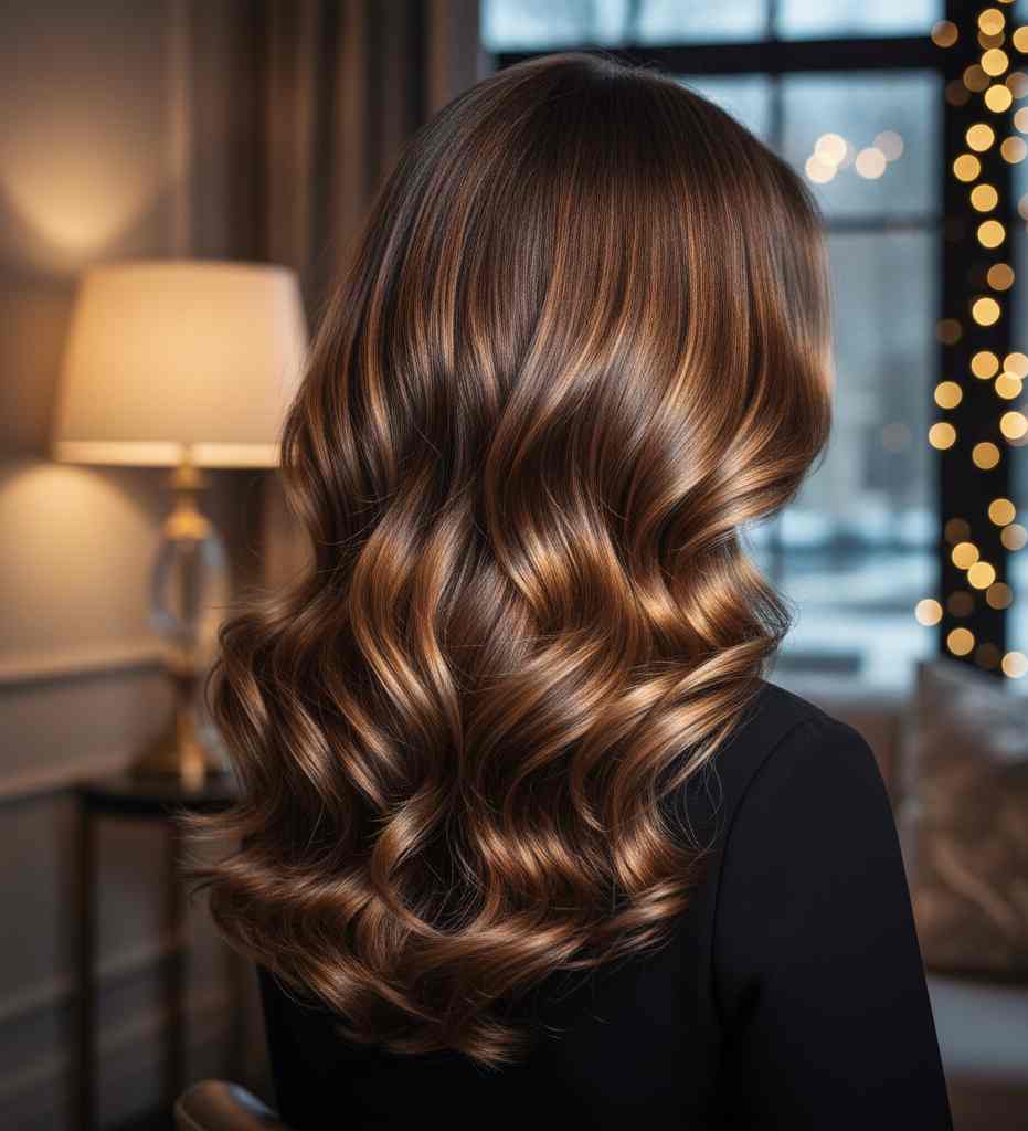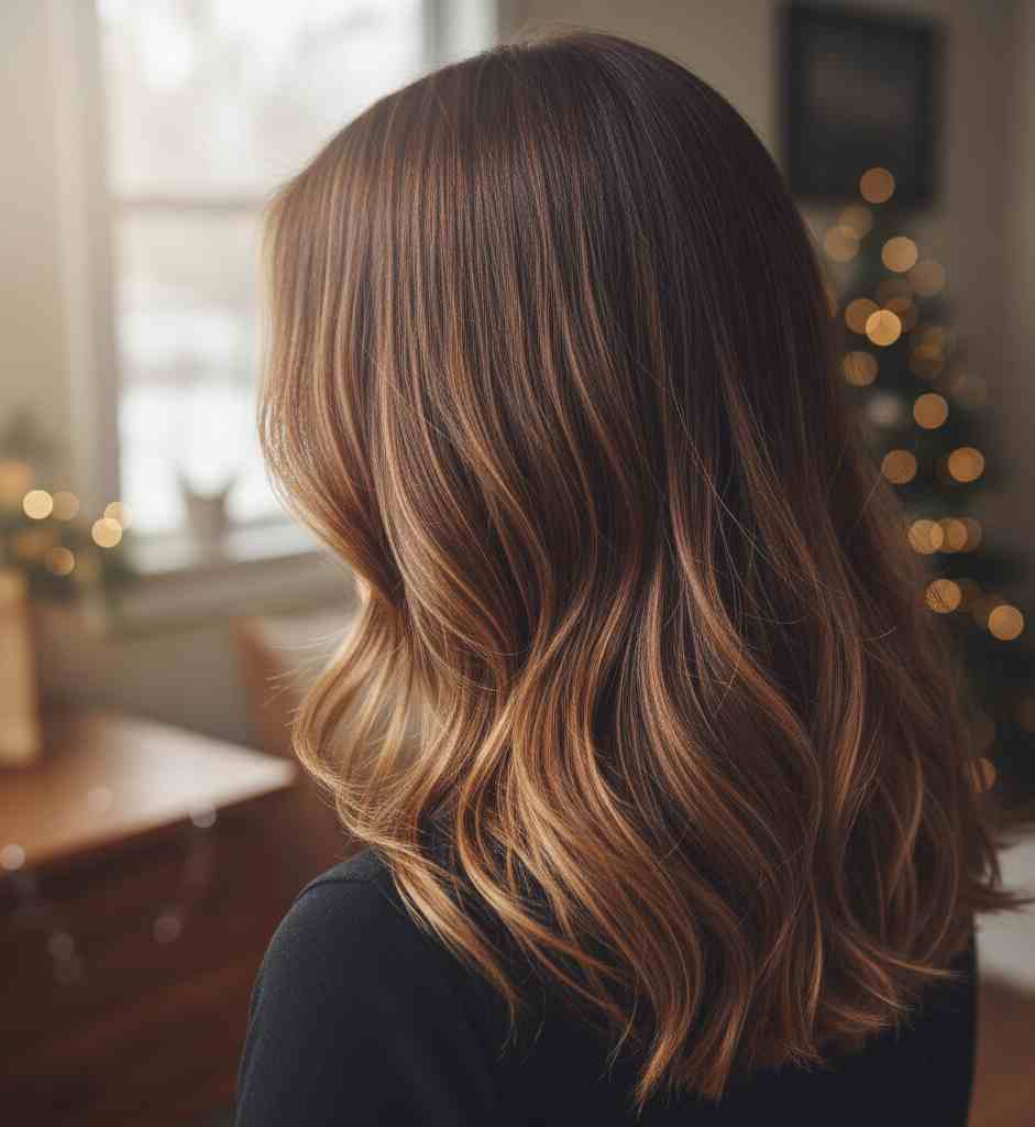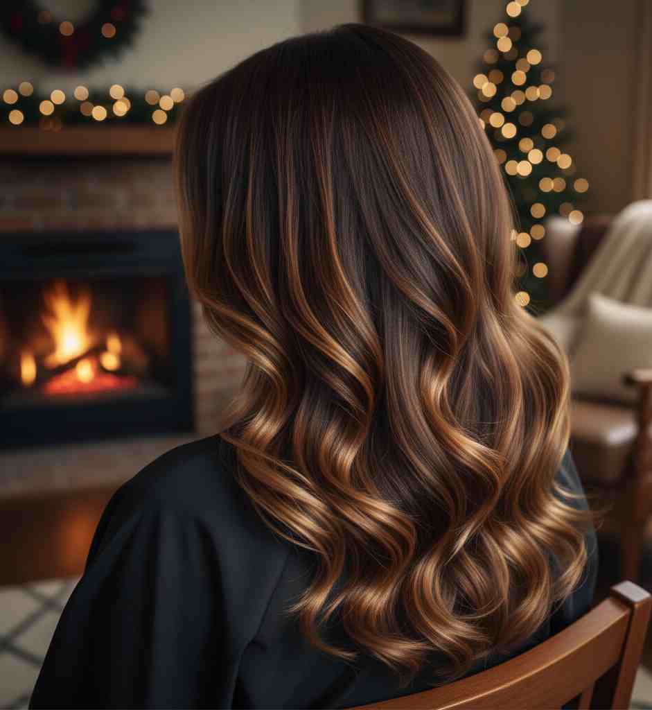 This shade adds depth at the roots and gentle highlights that catch the winter light. It’s low-maintenance and ideal for darker brunettes.