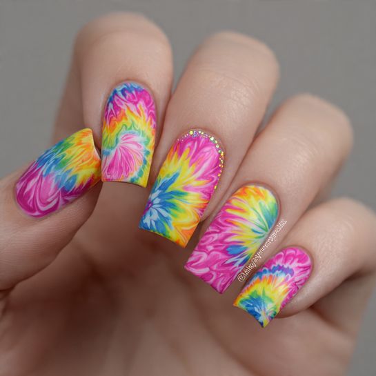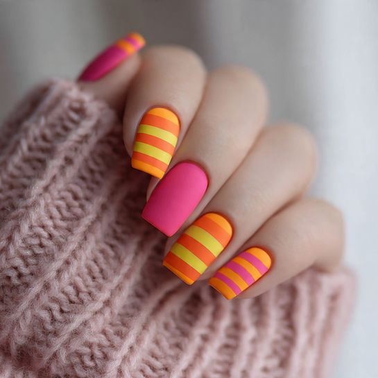 Make a bold statement with electric stripes that capture the energy of spring’s longer days. This design features vivid bands of hot pink, orange, and yellow that create a sunset effect on your fingertips.