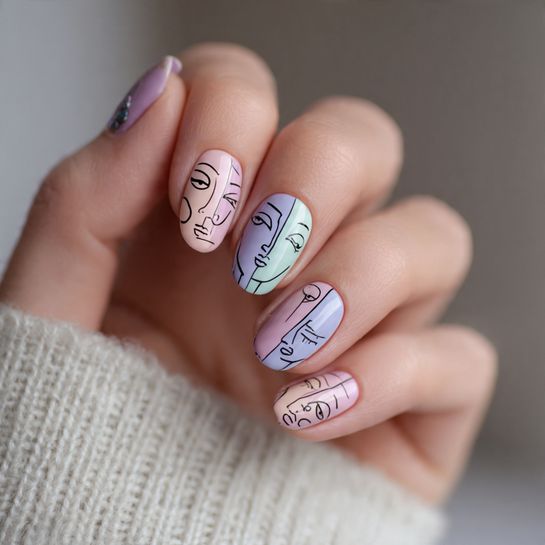 Embrace artistic sophistication with abstract face sketches drawn in black on pastel backgrounds. This gallery-worthy design turns your nails into tiny canvases.
