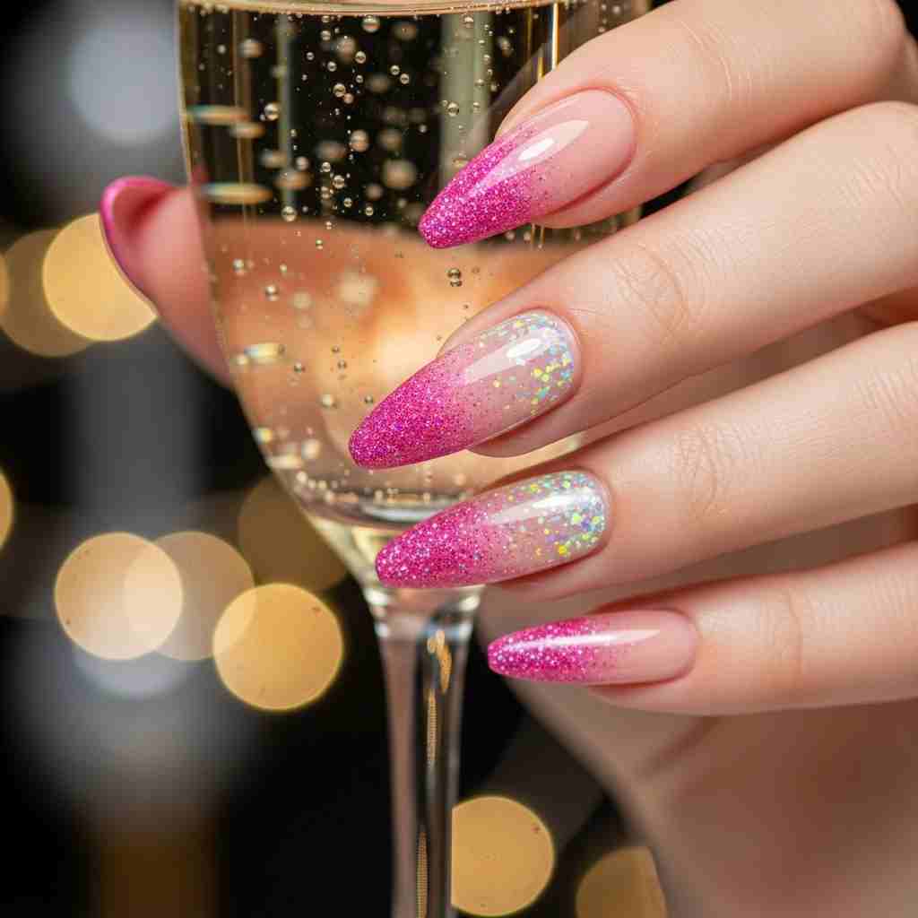 Mix sweet and sparkly with pink glitter gradients that fade into sheer nude. This glamorous design adds just the right amount of shimmer for spring celebrations.