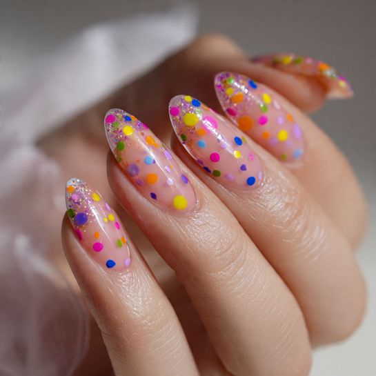 Scatter joy across your nails with colorful confetti dots on a sheer pink base. This festive design captures the celebratory spirit of spring gatherings.