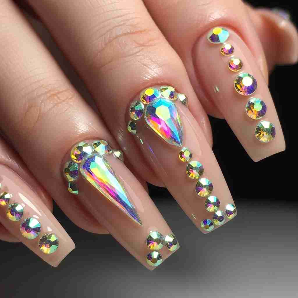 End on a high note with rainbow crystal embellishments catching light on nude bases. This luxurious design proves that sometimes, a little sparkle is everything.