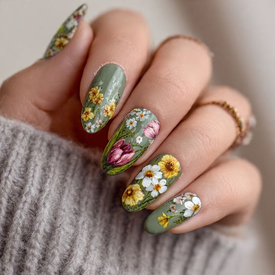 Bring the entire flower garden to your nails with a mix of daisies, tulips, and wildflowers painted across a sage green background. This maximalist design is for those who believe more is definitely more.