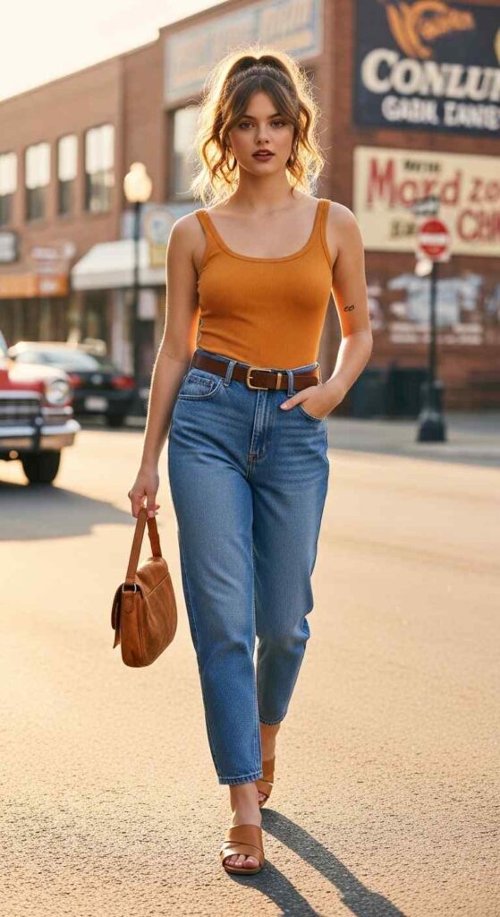 High-waist vintage-style jeans with simple tank creates retro teen aesthetic.