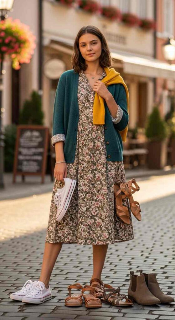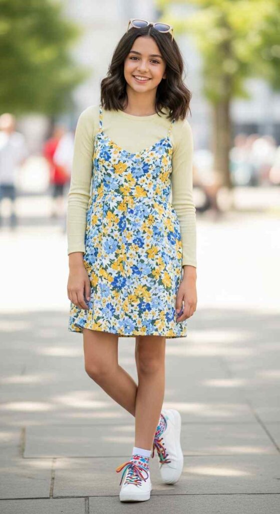 Floral or solid sundress with tee underneath creates layered teen creativity.