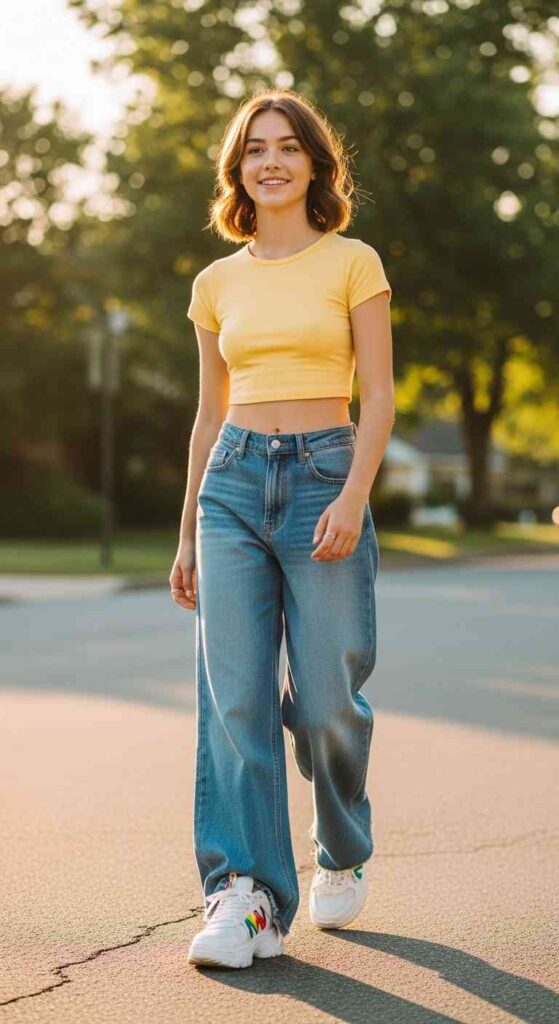 Y2K-inspired baggy jeans with fitted baby tee creates nostalgic teen style.