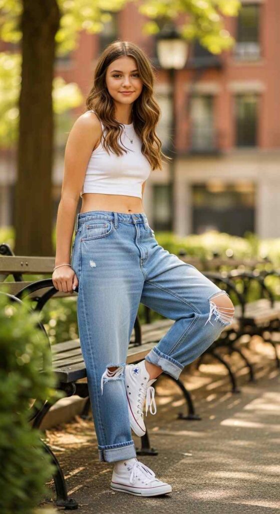 Oversized boyfriend jeans with crop creates relaxed teen cool.