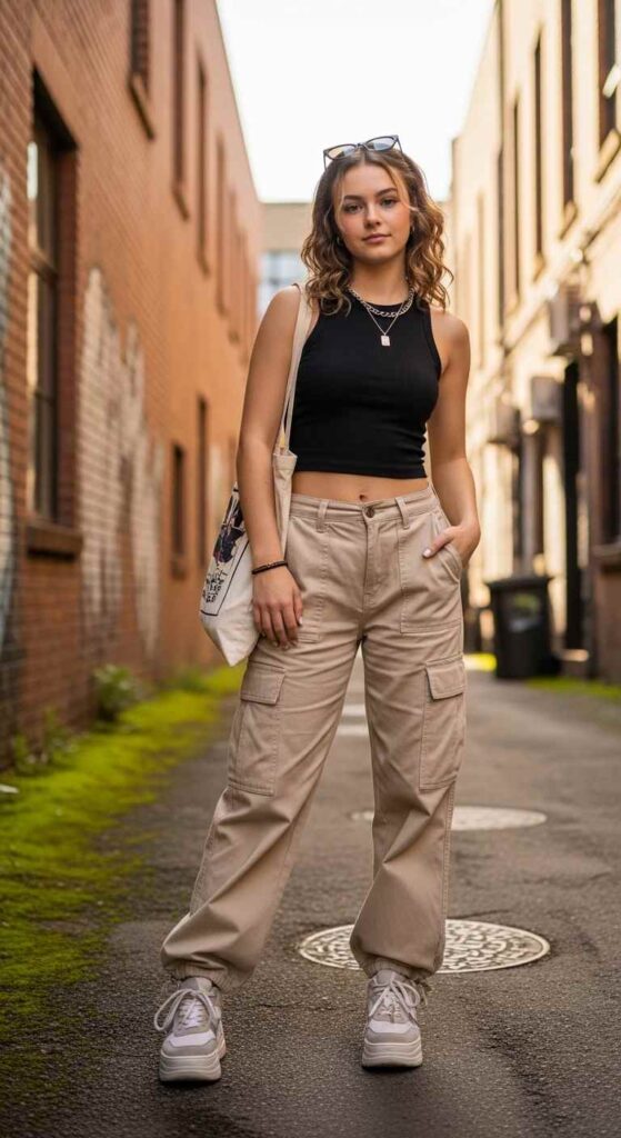 Low-rise or regular cargo pants with tank creates utilitarian teen trend.