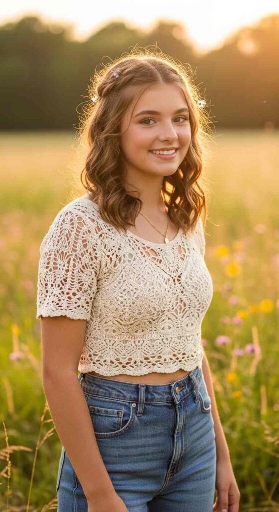 Crochet or knit top with jeans or skirt creates summery teen femininity.