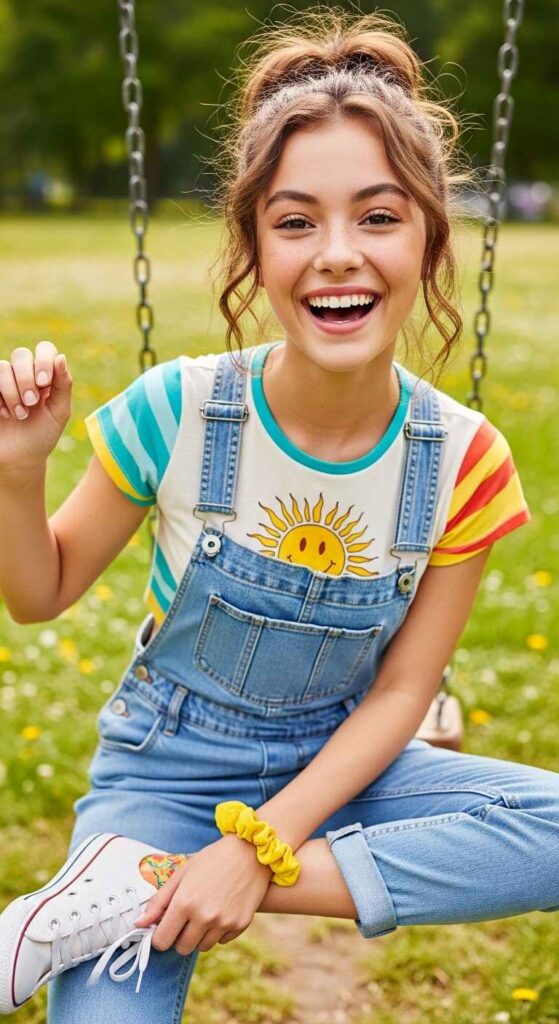 Denim overalls with crop or tee underneath creates playful teen charm.