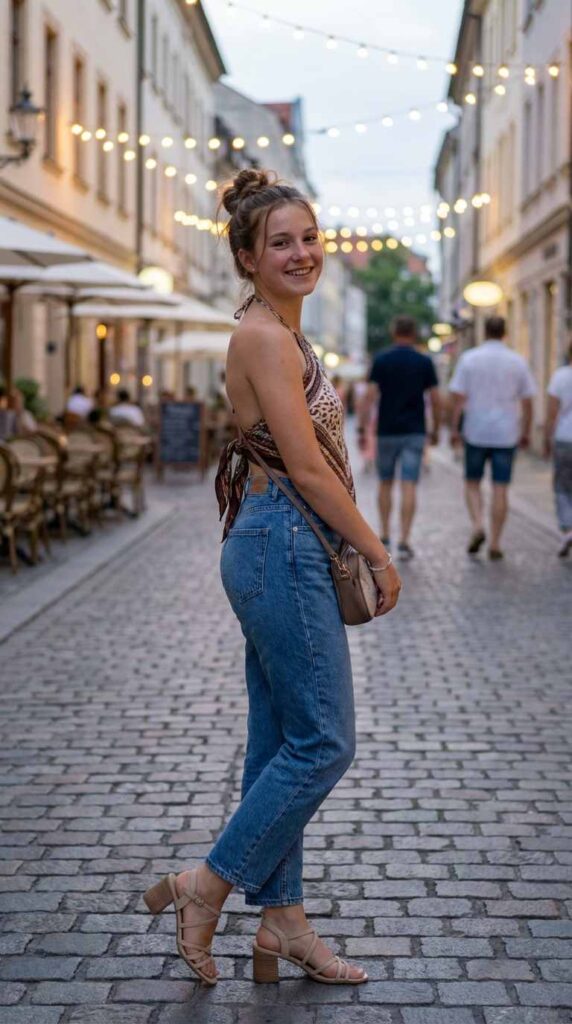 Halter-neck top with jeans or skirt creates going-out teen style.