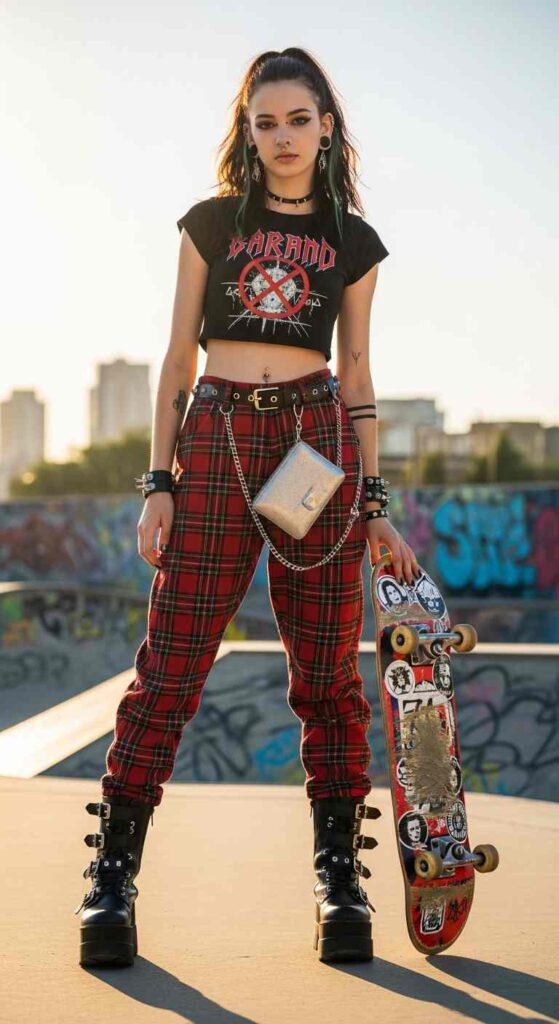 Plaid or checkered pants with crop top creates alternative teen edge.