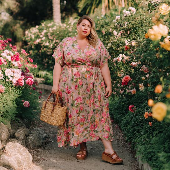 A flowing wrap dress in a vibrant spring floral print paired with comfortable wedge sandals creates an effortlessly feminine silhouette that flatters curves beautifully.