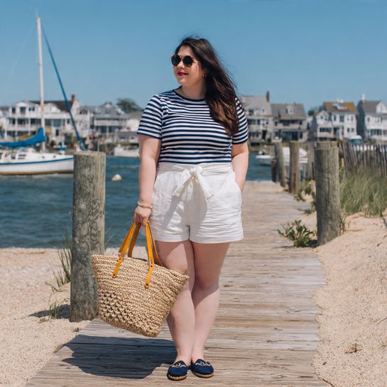 A classic striped boatneck tee tucked into high-waisted paperbag shorts with the tie belt creates nautical-inspired spring charm.