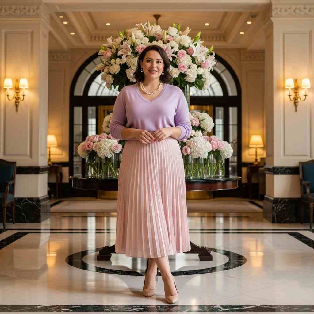 Why it works: The V-neck elongates the neckline and draws the eye upward while the pleated skirt adds graceful movement without clinging. This combination flatters beautifully.