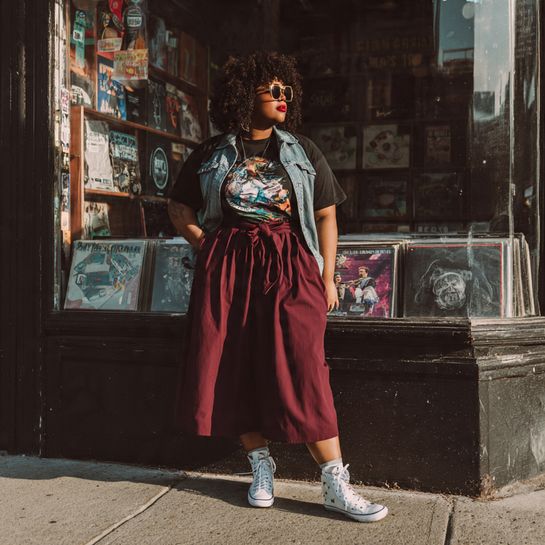 A fun graphic tee featuring favorite bands, quotes, or designs tucked into a solid-color midi skirt with sneakers creates personality-filled casual style.
