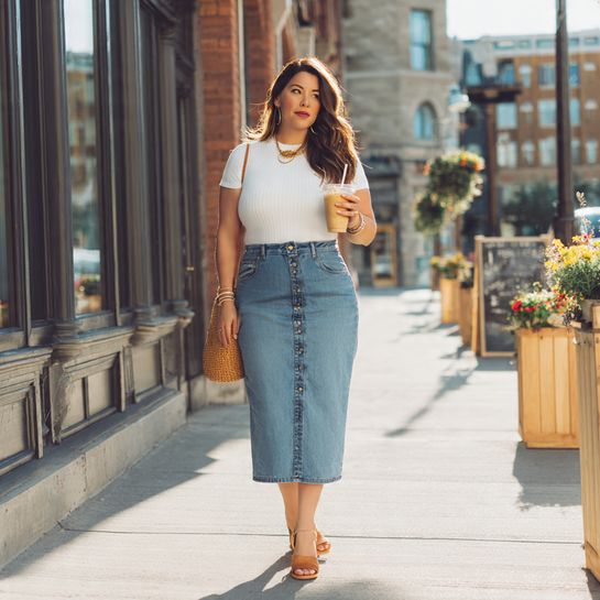 A denim or cotton button-front midi skirt paired with a fitted ribbed tee tucked in creates balanced casual sophistication.