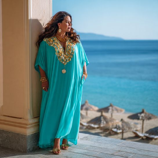 A flowing caftan-style dress in a bold print or solid jewel tone paired with simple flat sandals creates relaxed vacation elegance.