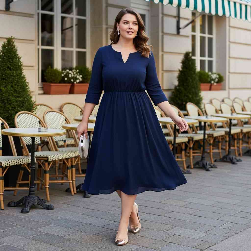Why it works: The fitted bodice highlights the waist while the flared skirt provides coverage and graceful movement. This timeless silhouette celebrates curves while offering comfort.