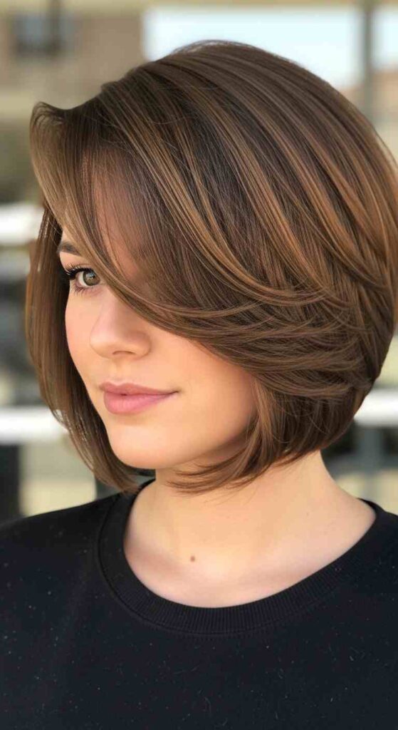 Curtain bangs soften the structure and frame the face beautifully.