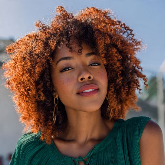 Metallic warm dimension. Copper tones painted through natural curls creates vibrant dimensional color.