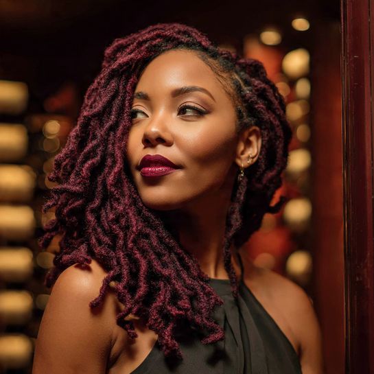 Mature loc aesthetic protection. Faux locs in deep burgundy creates dramatic protective sophistication.