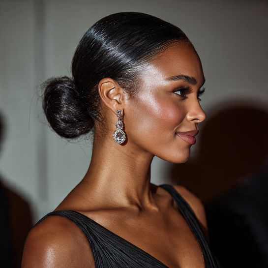 Polished elegant protection. Natural hair smoothed into low bun with laid edges creates sophisticated style.