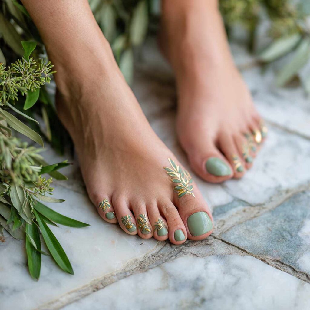 Apply sage green polish to all toesโthis muted green feels sophisticated and current. On the big toes, add small pieces of gold foil using foil adhesive or gel polish technique. The foil creates random metallic patterns that catch light beautifully. This design feels natural yet special, perfect for those wanting something beyond basic colors. The sage tone works with winter earth tones and spring’s natural palette equally well.