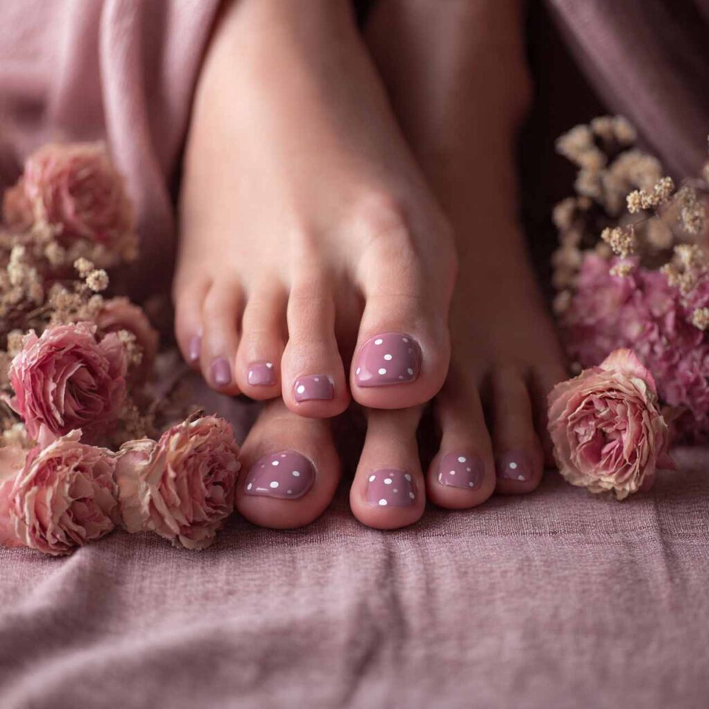 Paint all toes in dusty roseโa muted, sophisticated pink. Add white dots to the big toes using a dotting tool, creating either a scattered or organized pattern. The dusty rose feels romantic and mature while white dots add whimsy without being childish. This design bridges winter’s muted tones and spring’s fresh energy. Perfect for those wanting something feminine and pretty with subtle detail.