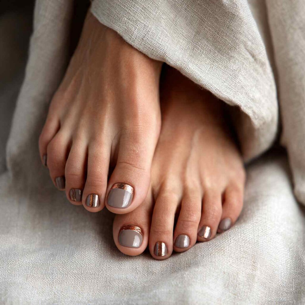 Apply warm taupe polish to all toesโthis neutral works with everything. Add a thin horizontal or vertical rose gold stripe on the big toes using striping tape or a fine brush. The taupe provides a subtle, sophisticated base while rose gold adds contemporary metallic shimmer. This design works for professional settings, casual wear, or special occasions. The neutral palette ensures it coordinates with any outfit or shoe choice.