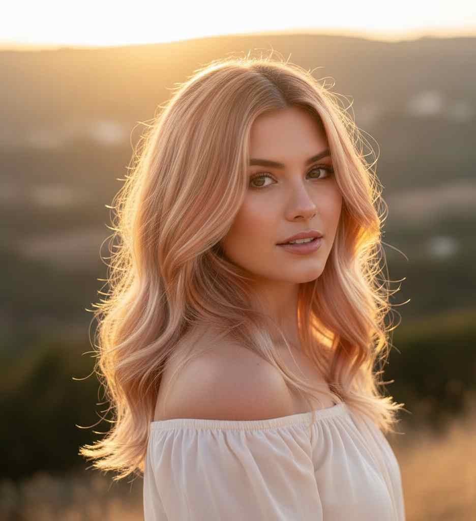 A warm blonde base with peachy, rose gold, and golden tones mixed throughout—like a beautiful sunset captured in hair color.