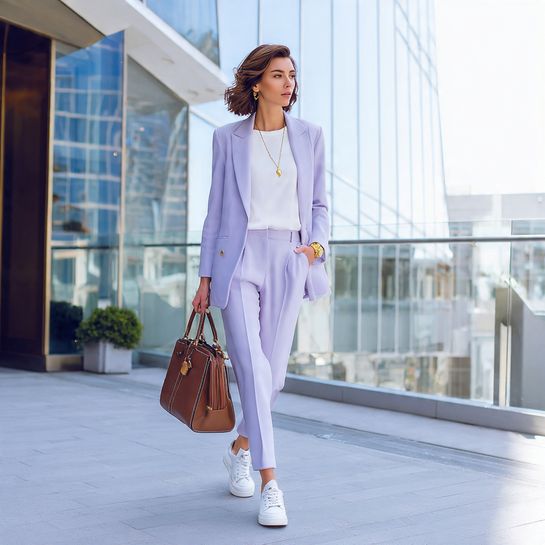 Modern professional polish. Soft lavender or mint suit with casual sneakers creates contemporary office elegance with comfort.