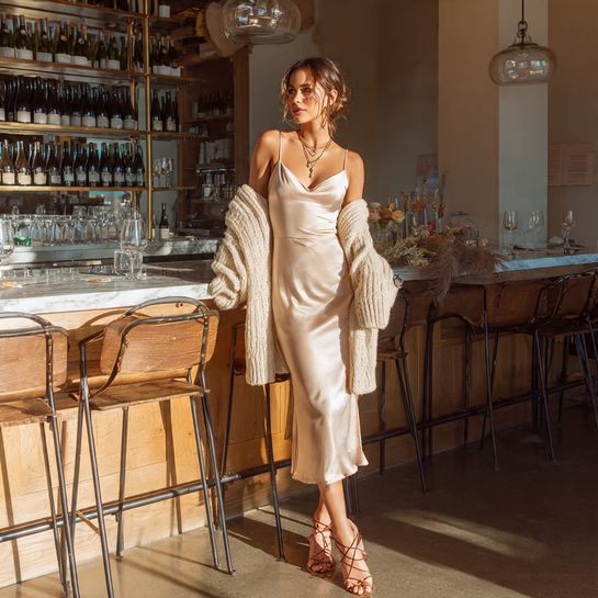 Layered feminine ease. Satin-finish slip dress with cozy cardigan creates temperature-adaptable spring elegance.