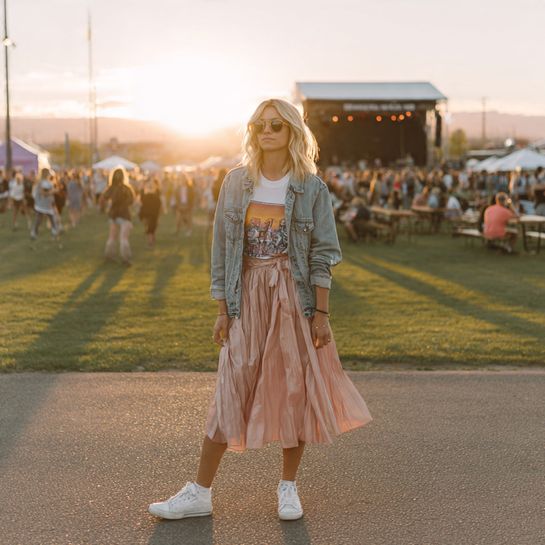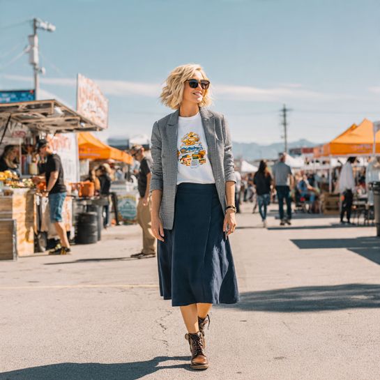 Casual meets feminine. Vintage-style tee tucked into flowing skirt creates unexpected balanced combination.