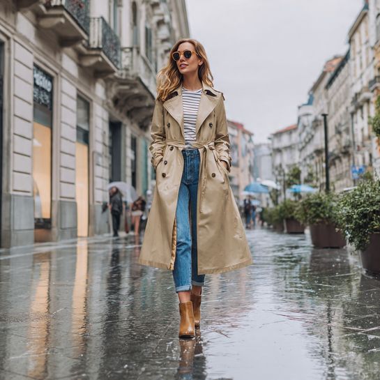 Classic outerwear versatility. Beige trench transforms any basic outfit into polished spring look.