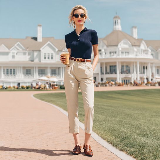 Preppy casual refinement. Fitted knit polo tucked into neutral chinos creates clean spring foundation.
